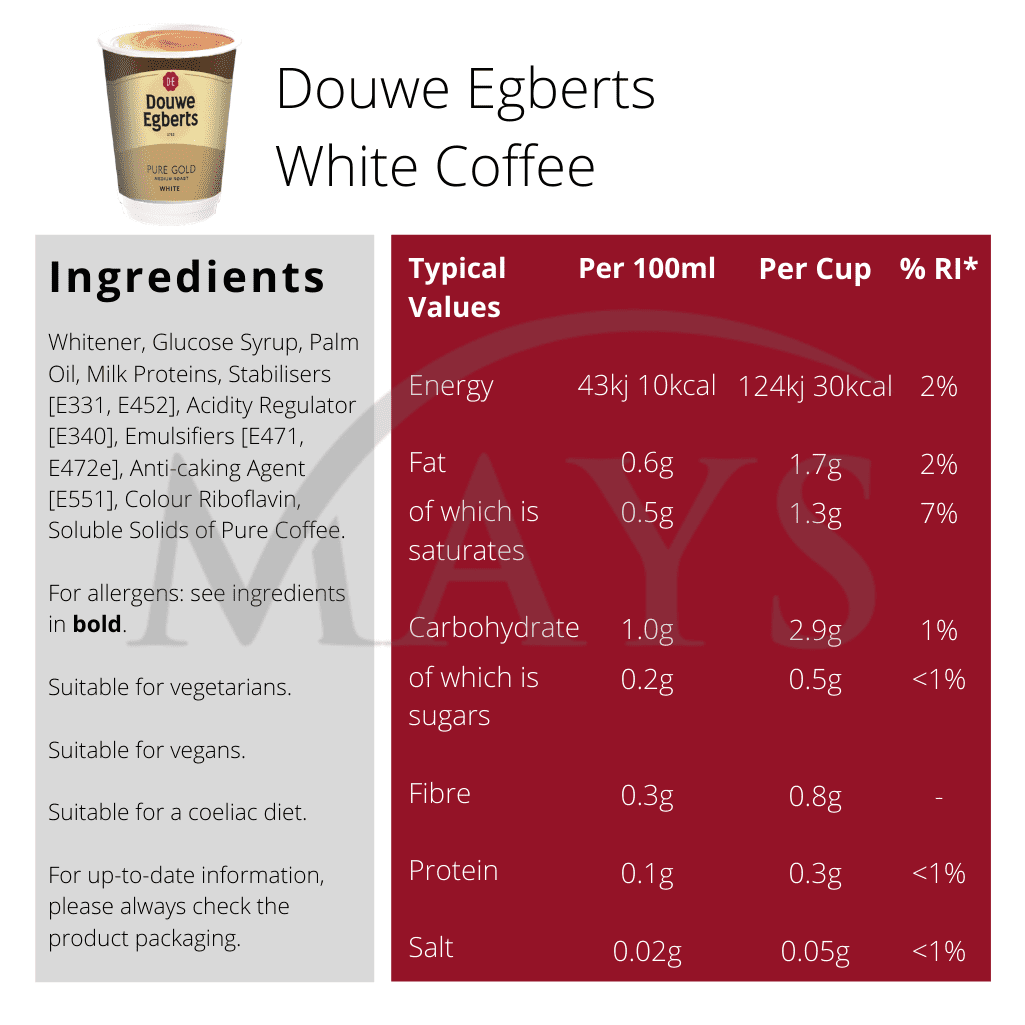 Ingredients: Whitener: Glucose Syrup, Vegetable Oil, Stabilisers (Dispotassium Phosphate, Trisodium Citrate, Sodium Hexametaphosphate), Milk Protein, Emulsifiers (Mono- and Diglycerides of Fatty Acids), Anti- Caking Agent (Silicon Dioxide), Colour (Riboflavin). Coffee: Soluble Solids of Pure Coffee.