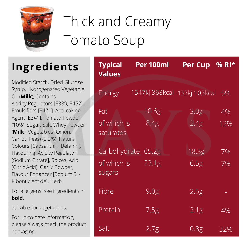 Ingredients: Modified Starch, Dried Glucose Syrup, Hydrogenated Vegetable Oil (Milk) (Contains Acidity Regulators [E339, E452], Emulsifier [E471], Anti-caking Agent [E341)], Tomato Powder (10%), Sugar, Salt, Whey Powder (Milk), Vegetables (Onion, Carrot, Peas) (3.3%), Natural Colours [Capsanthin, Betanin], Flavouring, Acidity Regulator [Sodium, Citrate], Spices, Acid [Citric Acid], Garlic Powder, Flavour Enhancer [Sodium 5'- ribonucleotide], Herb.